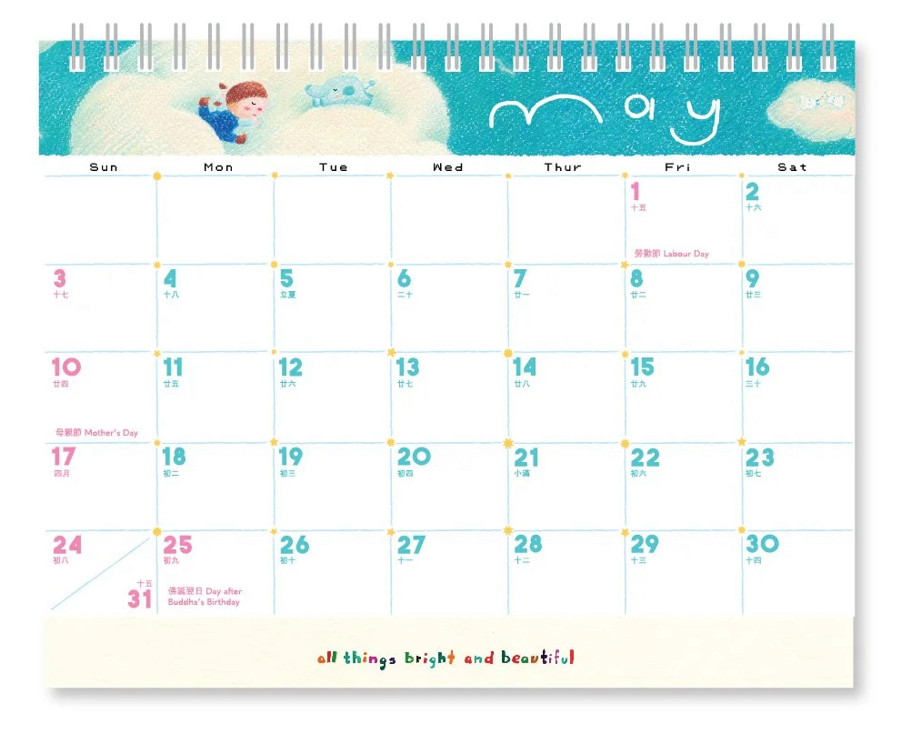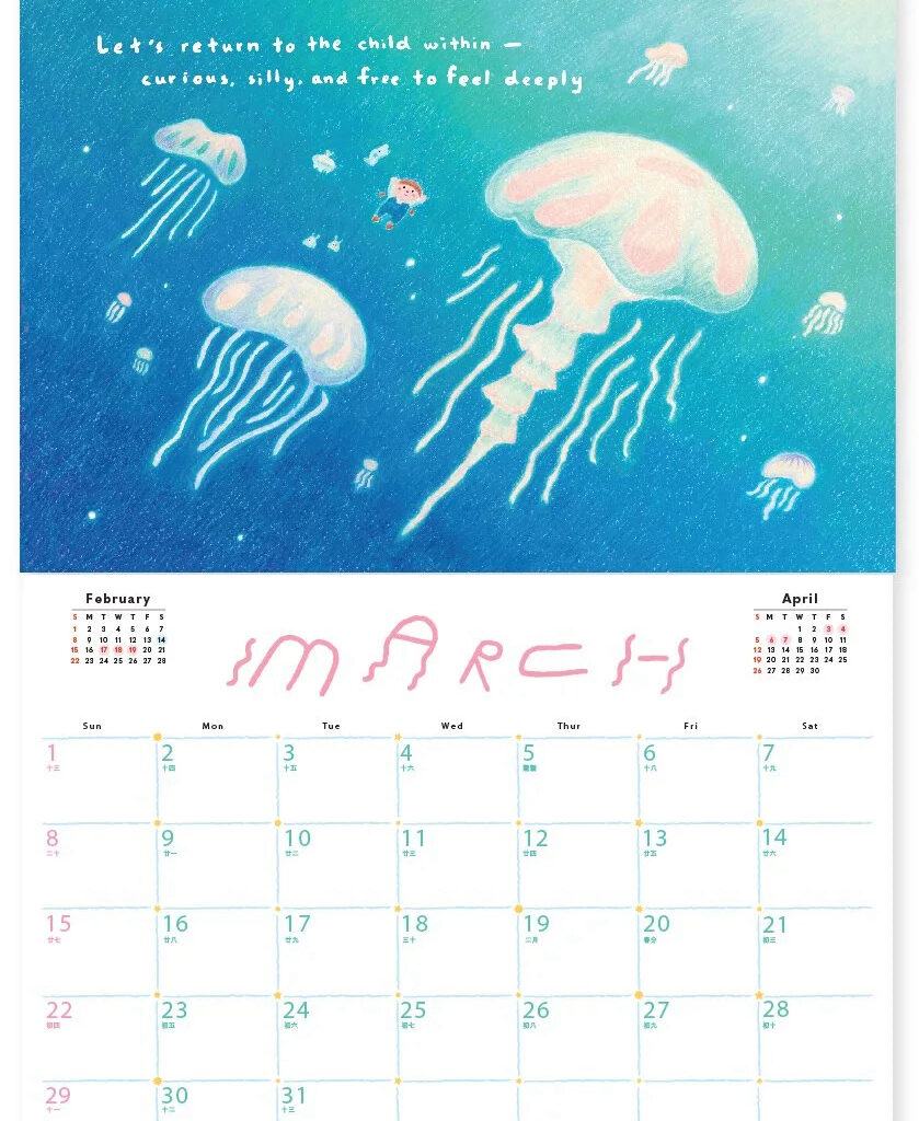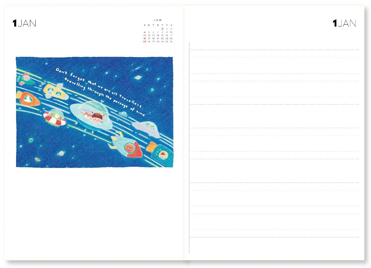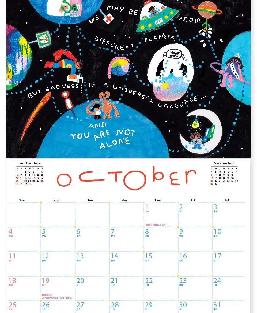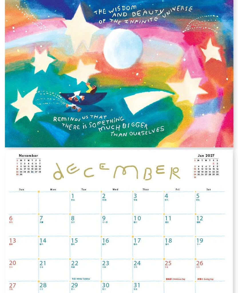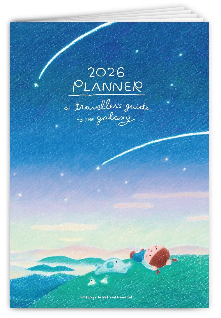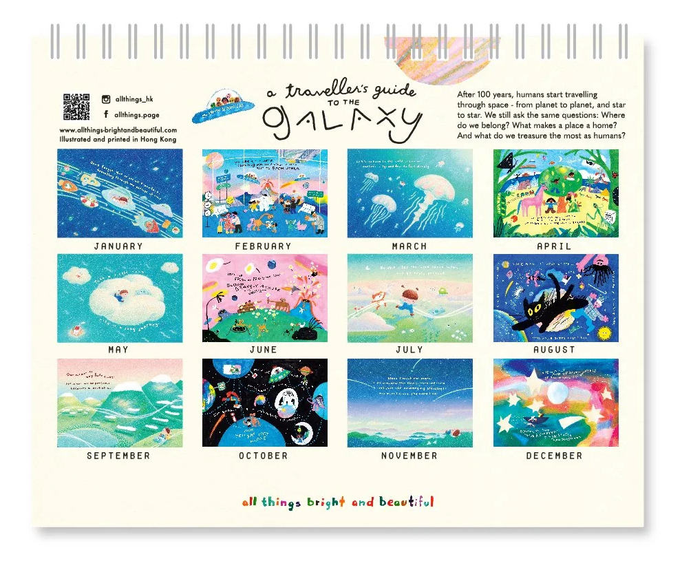 今年All Things的月曆主題是「星際旅行者指南」,幻想人類一百年後開始在星際旅行。這個主題引導我們思考:或許我們都是外星人,不屬於某個地方,而是屬於彼此。這不僅是一個關於身分認同的故事,更蘊含著對未來的無限想像。All Things的獨特之處,在於它以童趣且療癒的畫風,呈現孩童眼中的世界,同時也令成年人有著更深層的反思。今年亦同樣推出掛曆、桌曆及手帳,每個月份均印有手寫字的暖心字句,提醒在未來一年的你,捉緊每個獨特的時刻。