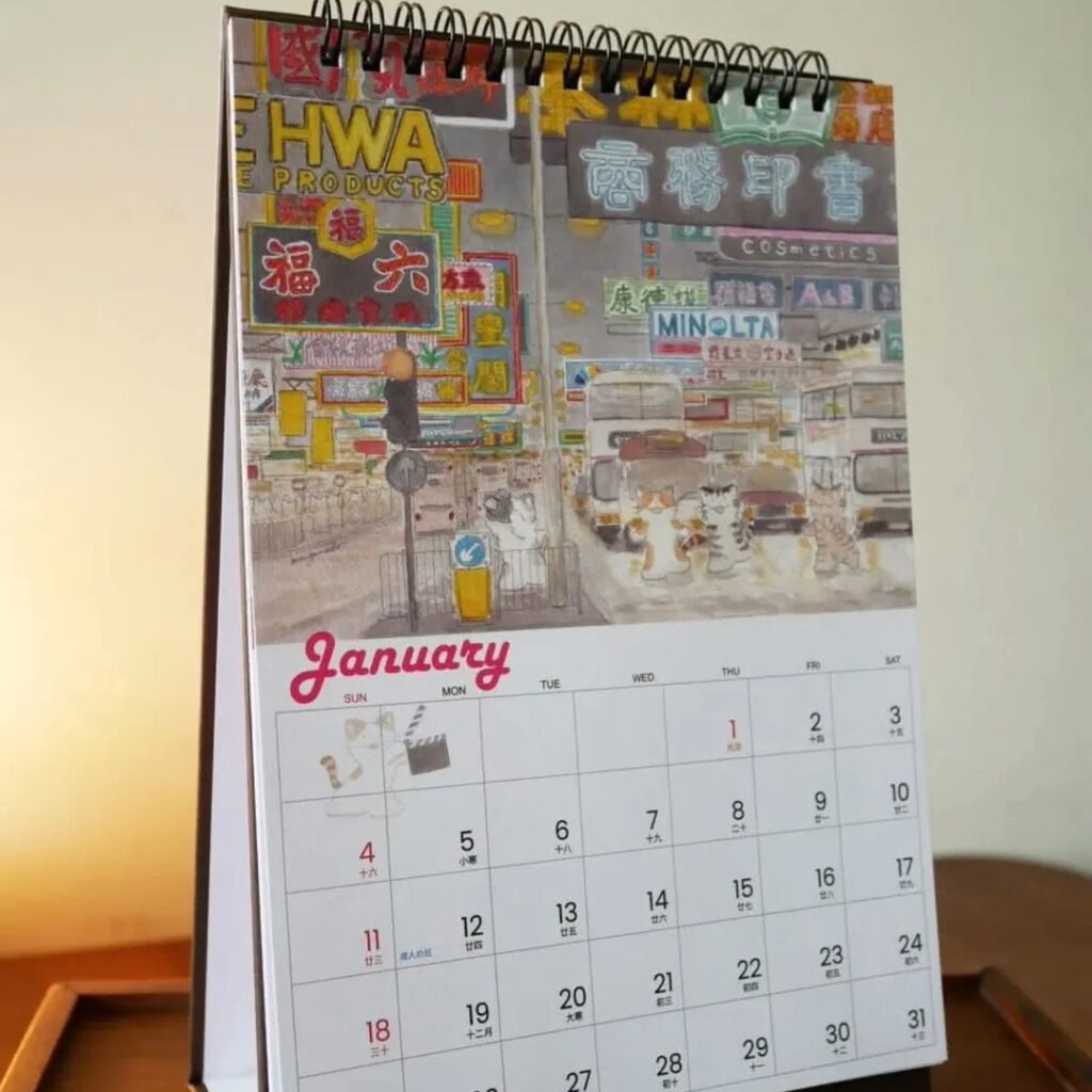 一向繪畫香港大街小巷的日籍居港插畫師Mango Naoko是位愛貓之人,在畫作中必定看見貓貓的蹤影。今年以「香港電影」為主題,繪畫了13幅香港電影的街頭場景,包括《重慶森林》裡的中環士丹利街及吉士笠、《九龍城寨》裡的茶餐廳等,製成每月一張貓貓帶你重溫經典電影的桌曆及掛曆(各$108)。月曆除了標註香港假期,還有日本假期添!