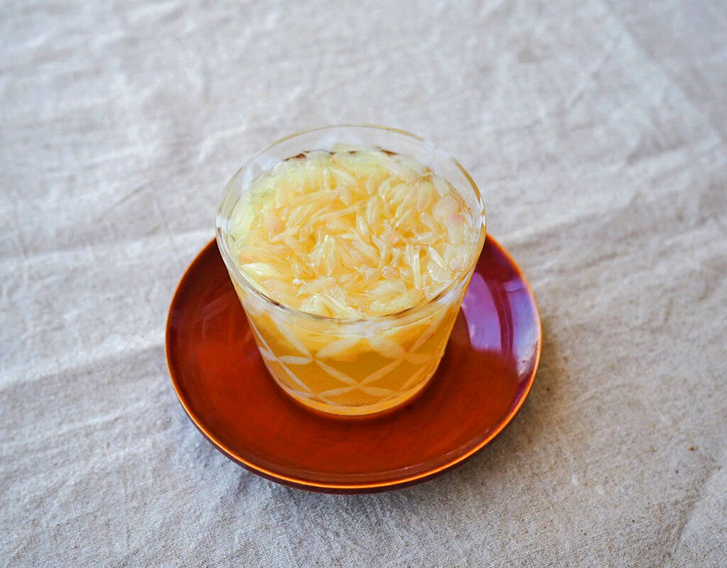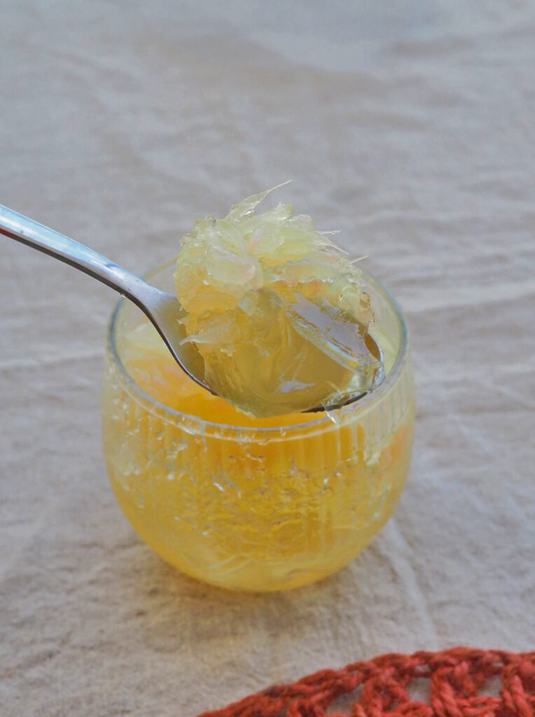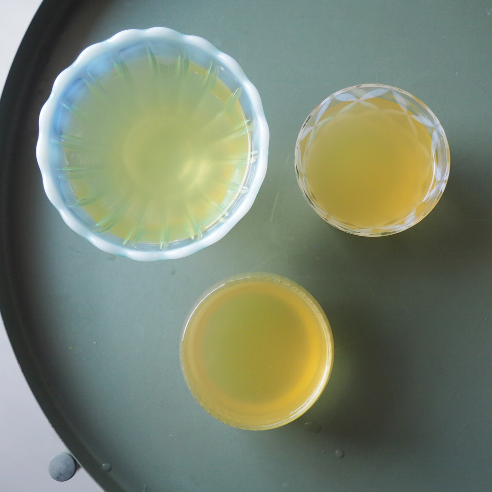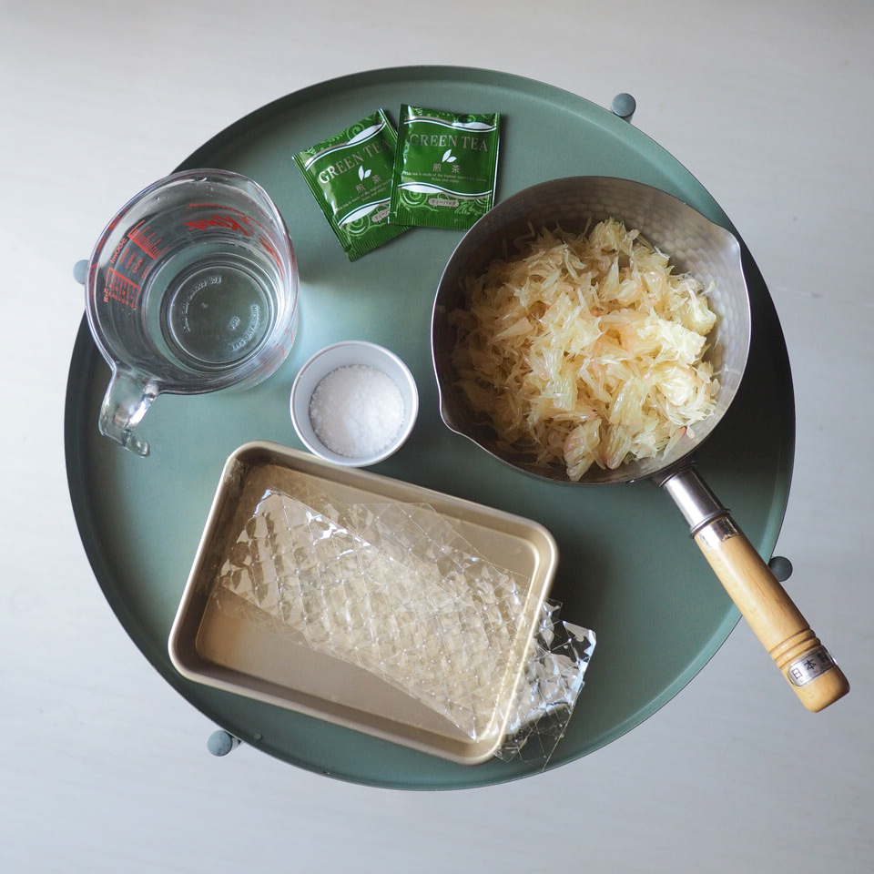 中秋期間,家中一定會出現金柚這個寓意團圓的當季水果,清爽酸甜的果肉能一解月餅的油膩感,除了直接吃,也可以用來做升級版的金柚果凍,延長中秋的滋味。我爸媽是那種吃水果要全部起肉、儲好一大碗,最後才一起開動吃的人,如果你家中也有這種寵壞家人的「水果起肉愛好者」,這款食譜應該不難製作,因為最花心機的部分就是起肉時,細心剔除附在果肉上的白膜,以免煮出來的柚子汁帶苦澀味。為了添加啫喱的層次,我也注入了煎茶,用上去日本旅行時酒店常附送的茶包,如果手邊有烏龍茶茶包,味道也會不錯。新鮮的粒粒金柚肉配搭柚子汁和煎茶做的啫喱,正是秋天清甜淡雅的味道。