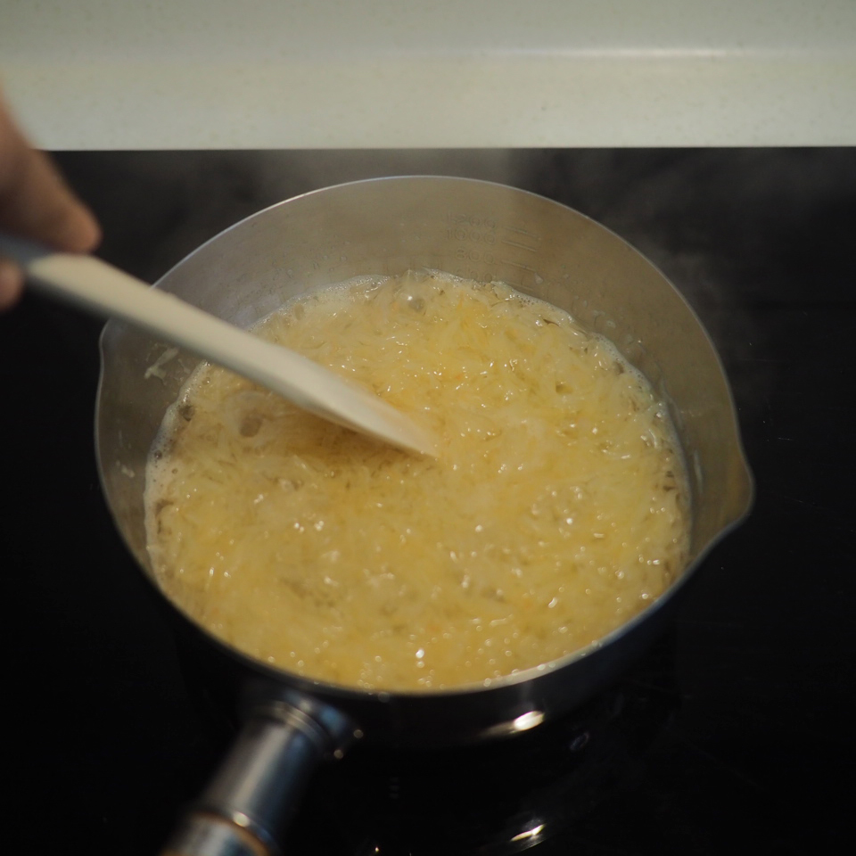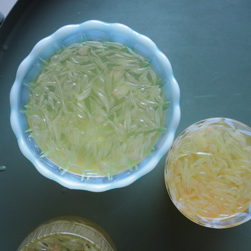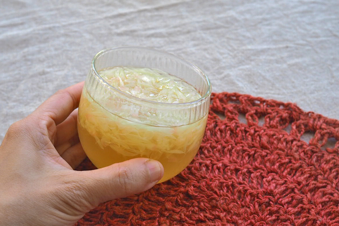 中秋期間,家中一定會出現金柚這個寓意團圓的當季水果,清爽酸甜的果肉能一解月餅的油膩感,除了直接吃,也可以用來做升級版的金柚果凍,延長中秋的滋味。我爸媽是那種吃水果要全部起肉、儲好一大碗,最後才一起開動吃的人,如果你家中也有這種寵壞家人的「水果起肉愛好者」,這款食譜應該不難製作,因為最花心機的部分就是起肉時,細心剔除附在果肉上的白膜,以免煮出來的柚子汁帶苦澀味。為了添加啫喱的層次,我也注入了煎茶,用上去日本旅行時酒店常附送的茶包,如果手邊有烏龍茶茶包,味道也會不錯。新鮮的粒粒金柚肉配搭柚子汁和煎茶做的啫喱,正是秋天清甜淡雅的味道。