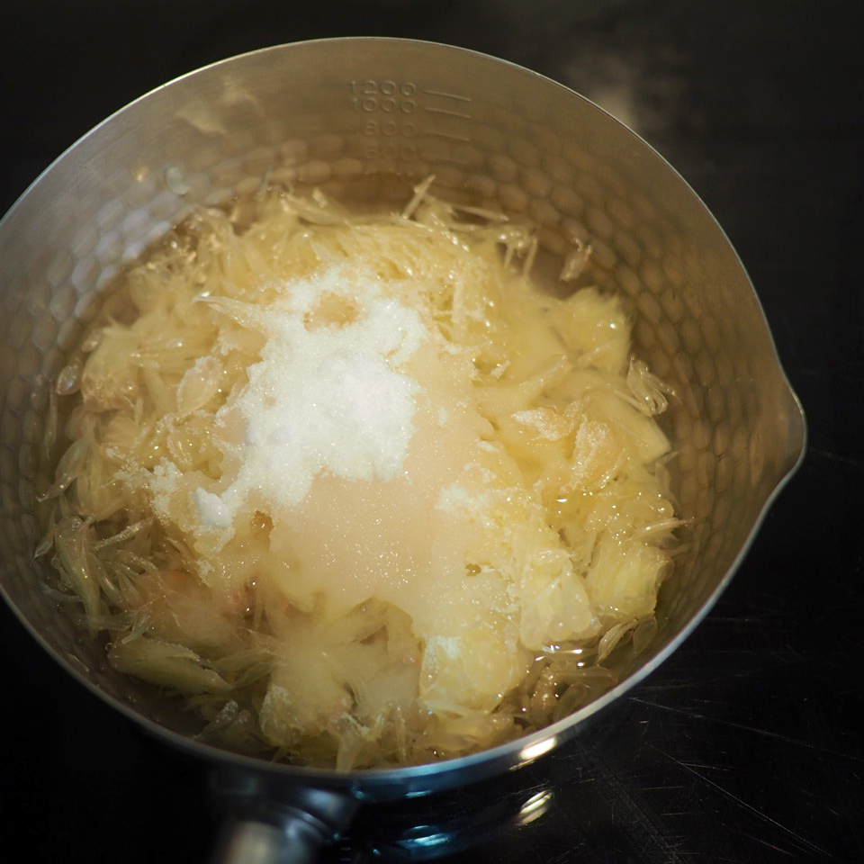 事前準備:將一個泰國金柚去皮起肉,剔除附在果肉上的白膜纖維