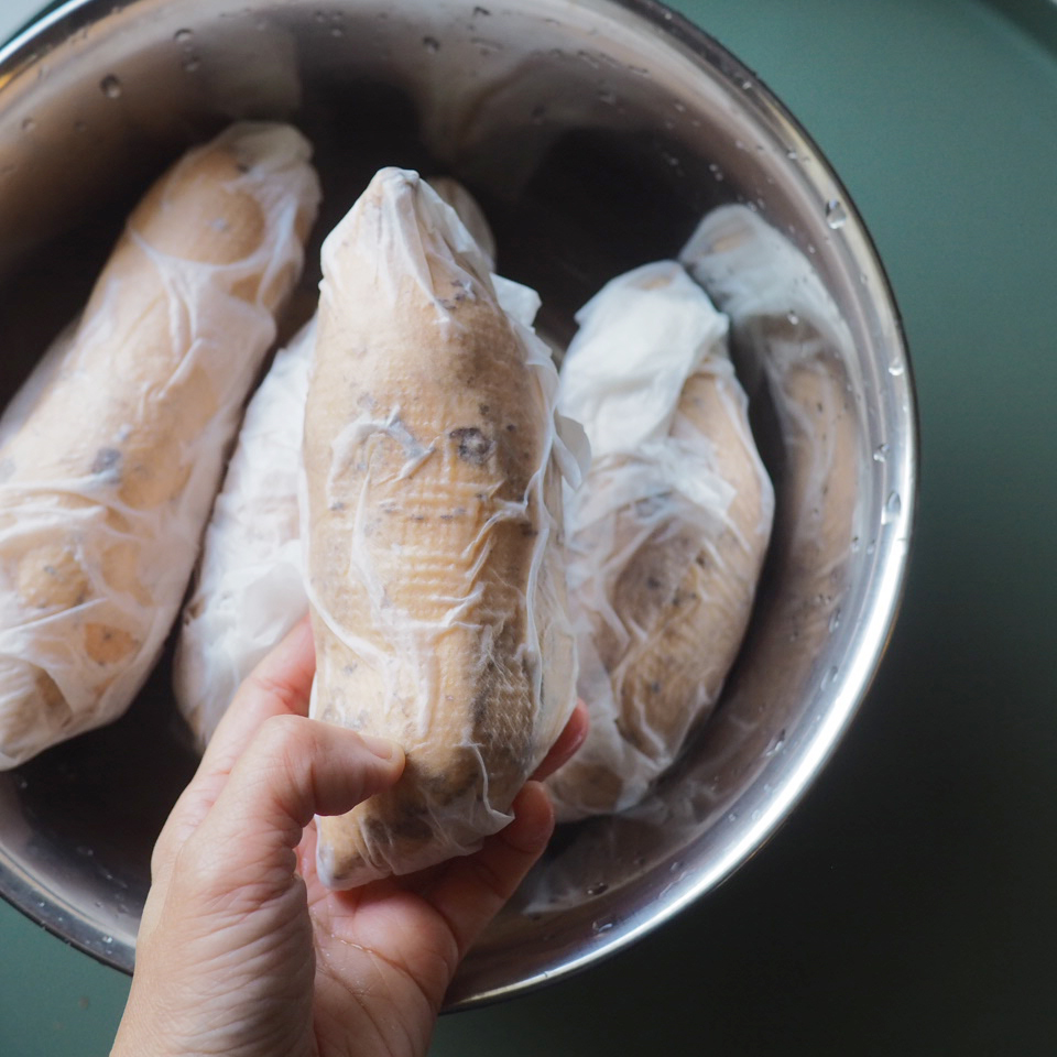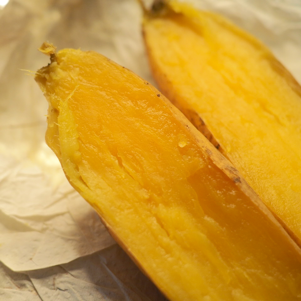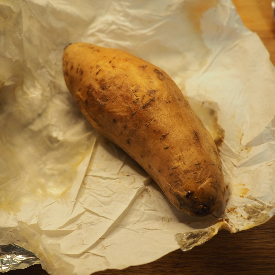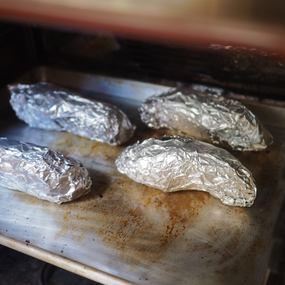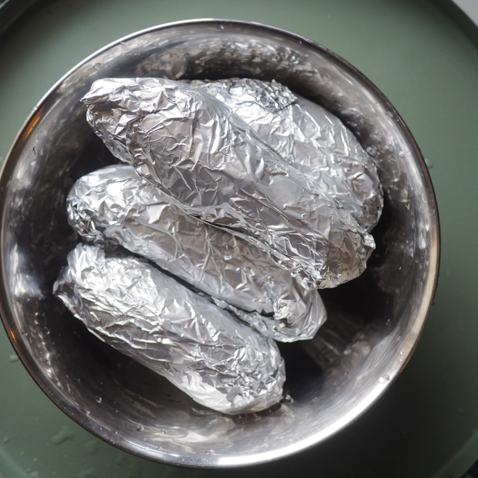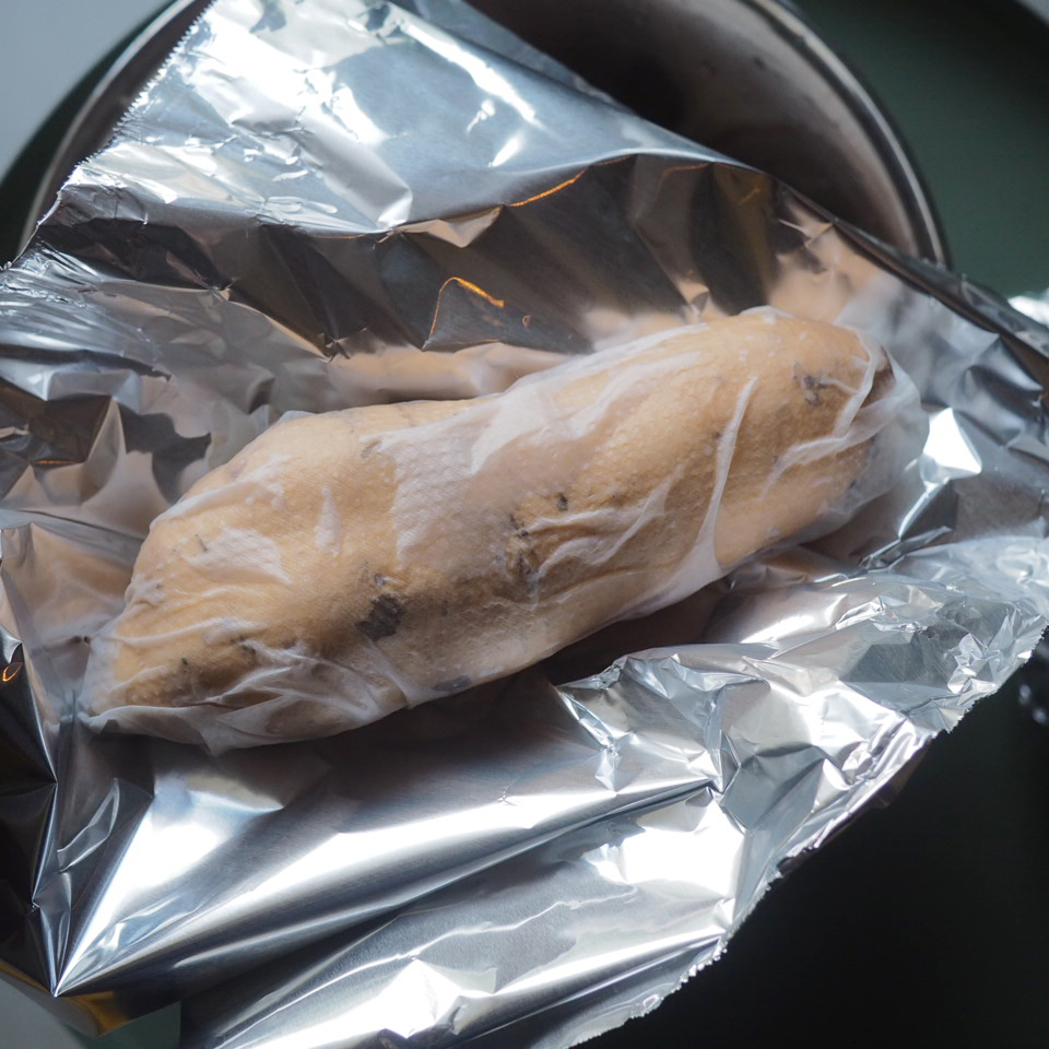 ① 將烤箱預熱至180度。清洗蕃薯後以廚房紙包好再浸濕,再以錫紙包好,入爐,大蕃薯可烤90分鐘,小蕃薯可烤75分鐘。烘烤途中可翻面一次,讓受熱更均勻。