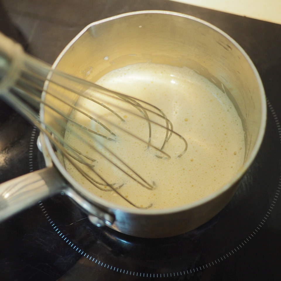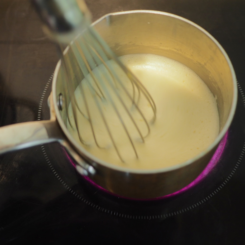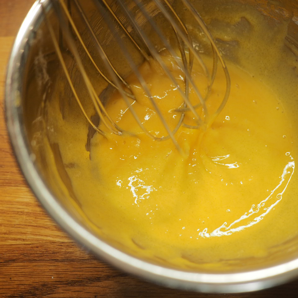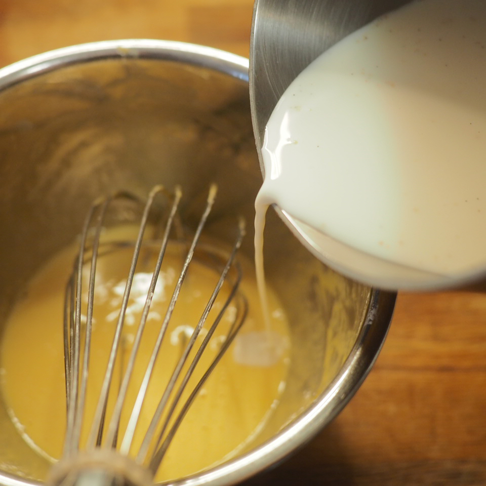 ② 製作吉士醬。小盤中將蛋黃與糖、過篩的粟粉混合,備用。鍋中牛奶中火加熱至冒煙後,一邊攪拌一邊分次將熱牛奶沖入蛋黃糊中,攪拌均勻。