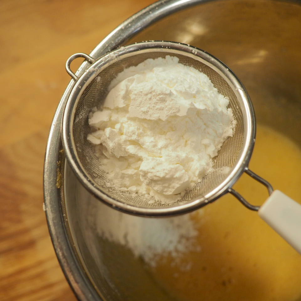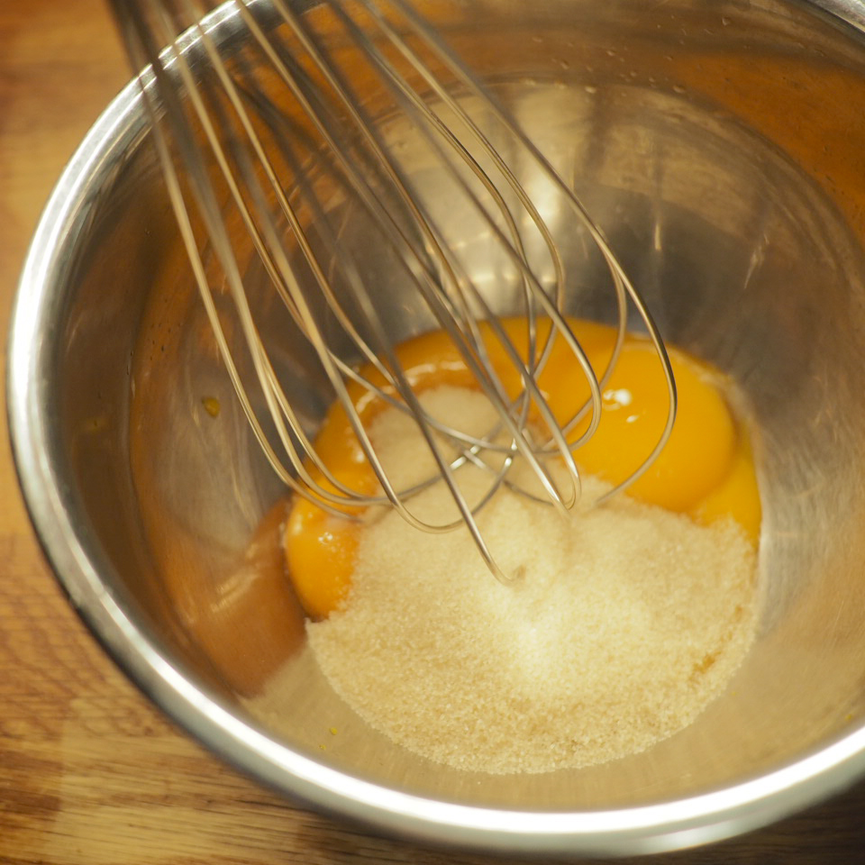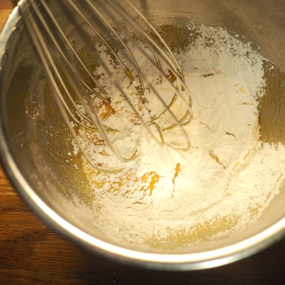 ② 製作吉士醬。小盤中將蛋黃與糖、過篩的粟粉混合,備用。鍋中牛奶中火加熱至冒煙後,一邊攪拌一邊分次將熱牛奶沖入蛋黃糊中,攪拌均勻。