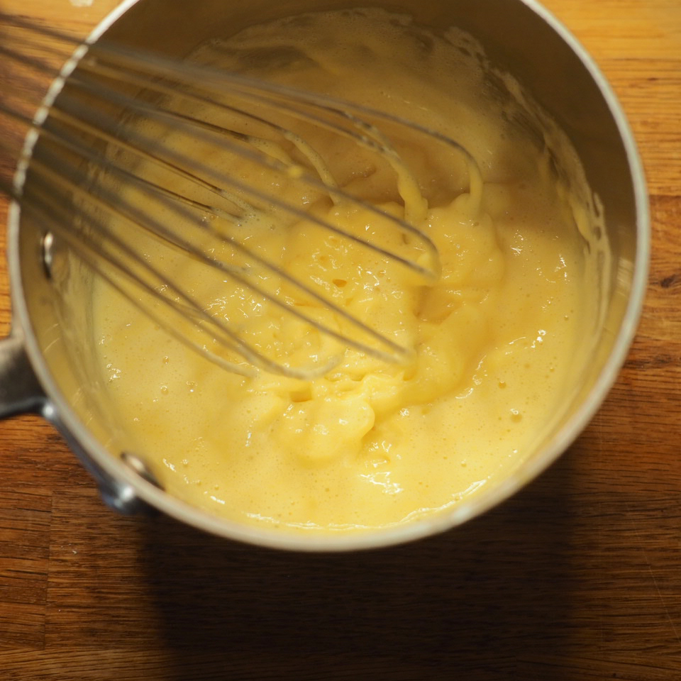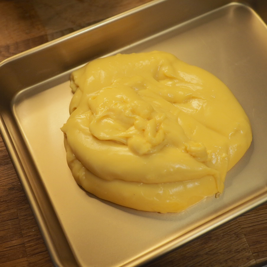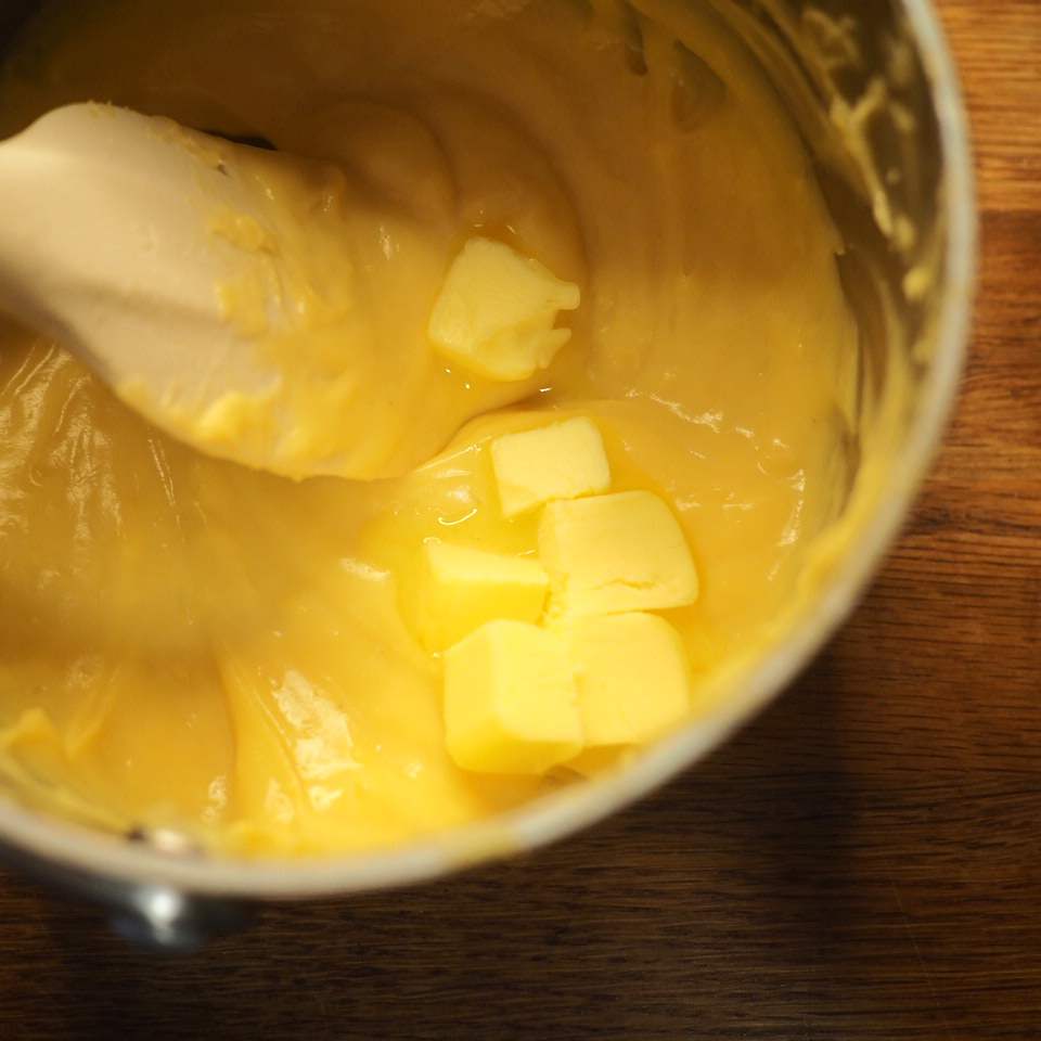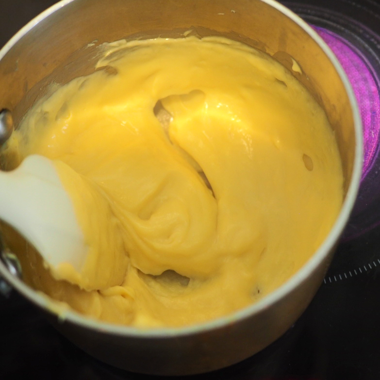 ③ 將混合物倒回鍋中用小火加熱,邊攪邊煮,蛋奶糊表面的泡沫會漸漸消失,之後會明顯變濃稠,此時立即離火拌勻。再回爐,以中小火加熱,一邊攪拌鍋底,直至整鍋微滾冒泡後,多煮30秒至1分鐘才算熟透,離火後趁熱加入奶油拌勻,放在平盤中可加速冷卻,用保鮮膜緊貼表面,冷藏30分鐘。