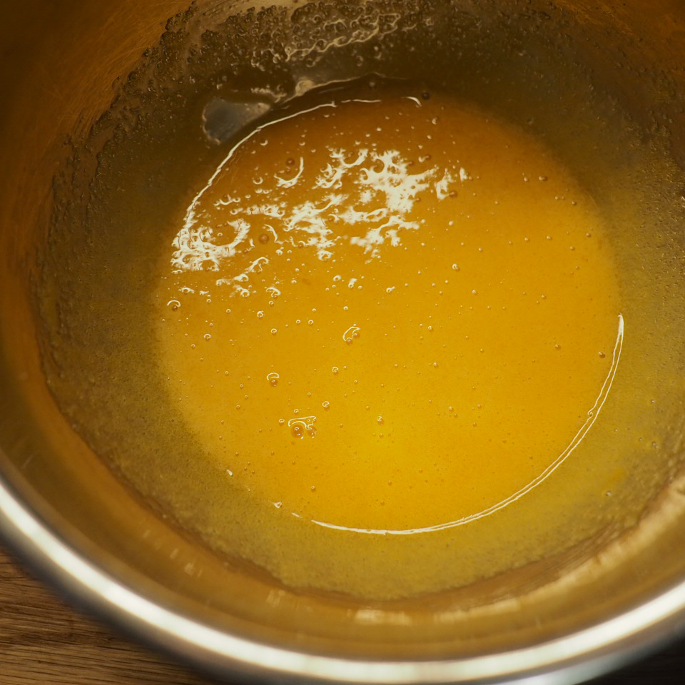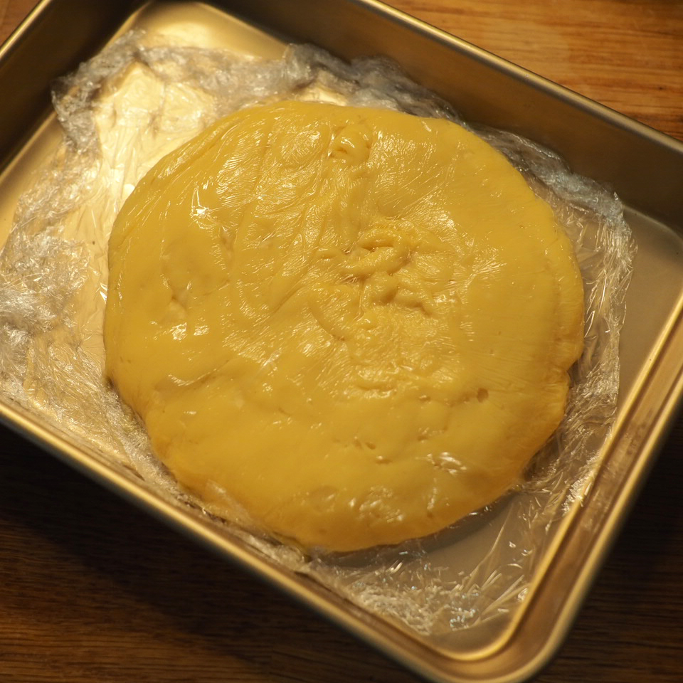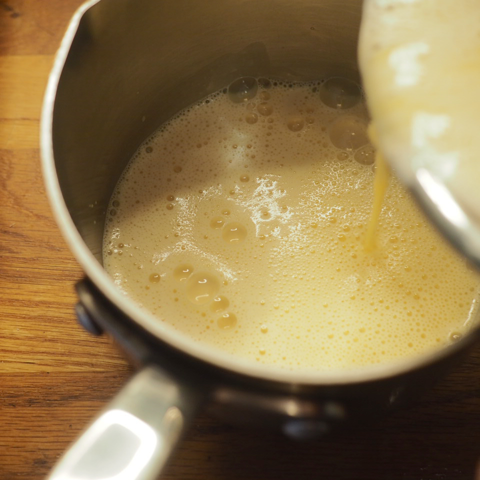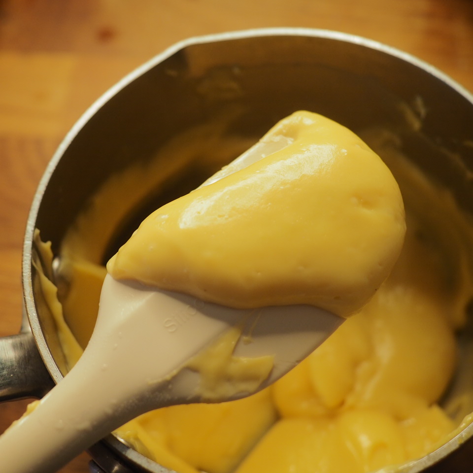 ③ 將混合物倒回鍋中用小火加熱,邊攪邊煮,蛋奶糊表面的泡沫會漸漸消失,之後會明顯變濃稠,此時立即離火拌勻。再回爐,以中小火加熱,一邊攪拌鍋底,直至整鍋微滾冒泡後,多煮30秒至1分鐘才算熟透,離火後趁熱加入奶油拌勻,放在平盤中可加速冷卻,用保鮮膜緊貼表面,冷藏30分鐘。