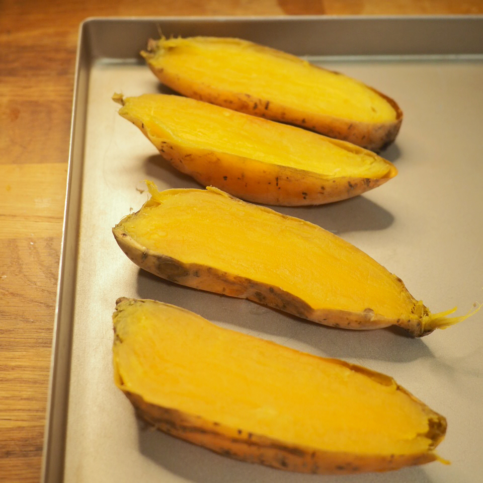 ④ 蕃薯烤好後,以隔熱手套取出,摸上手應該非常軟淋,肉質軟糯焦糖化,稍為攤涼後,可從中心垂直切開,放涼備用。