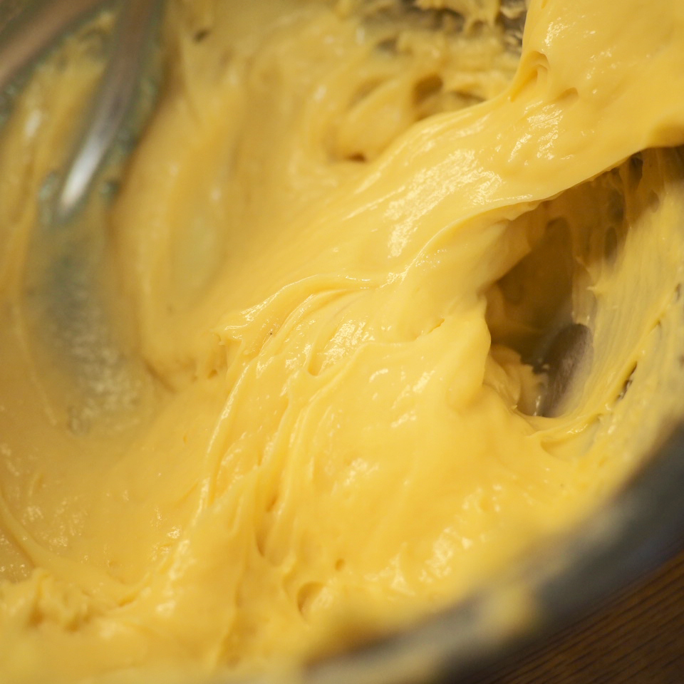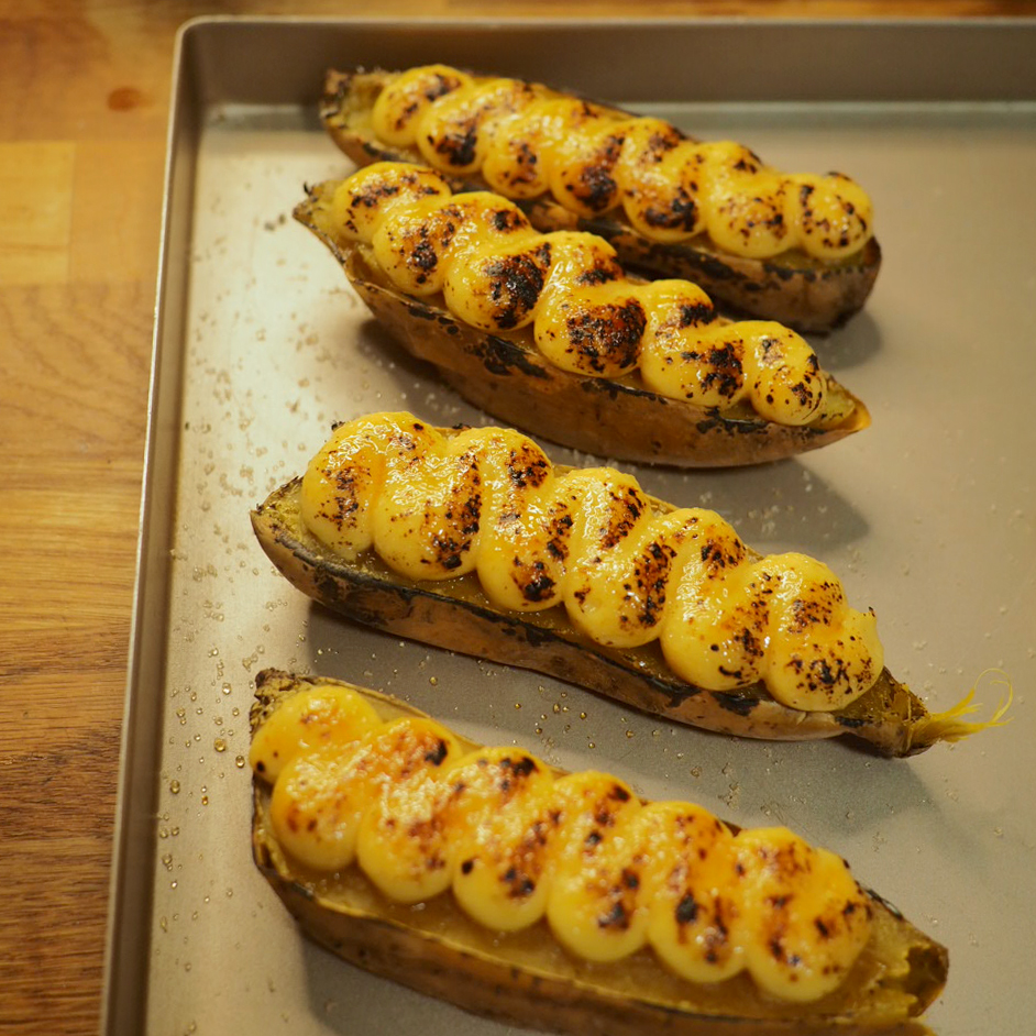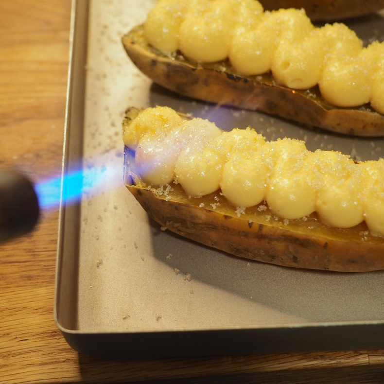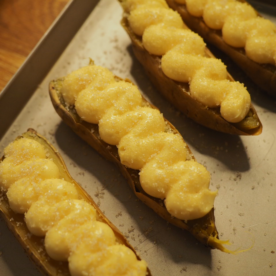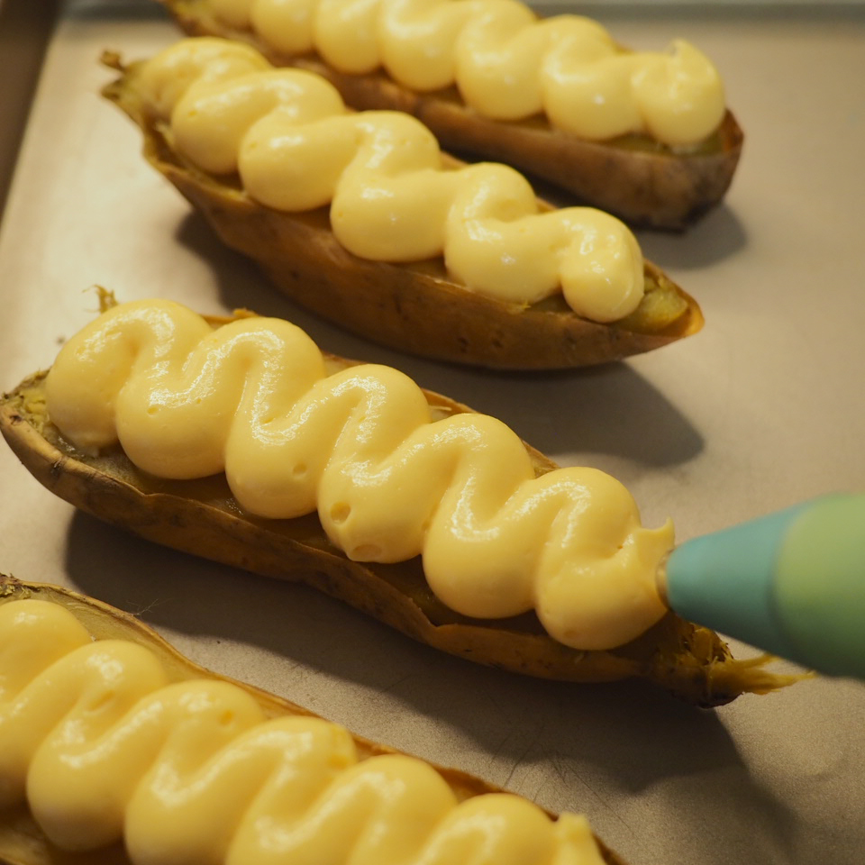 ⑤ 取出已放涼的吉士醬,以電動打蛋器打勻1-2分鐘,吉士醬會變得順滑有光澤,放入備有1cm直徑唧花咀的唧花袋,於蕃薯橫切面上以S型唧出吉士。最後均勻地撒上一層砂糖,以火槍炙燒出焦糖脆面。