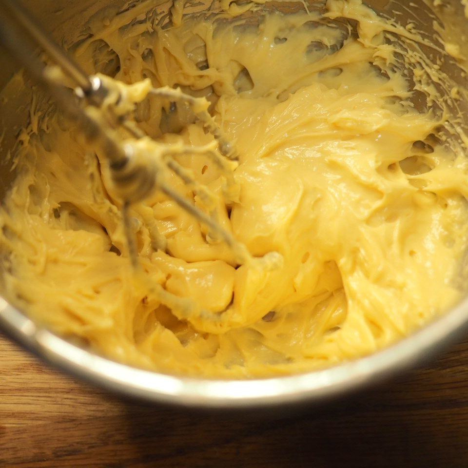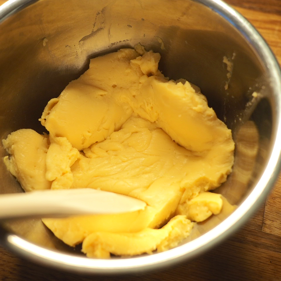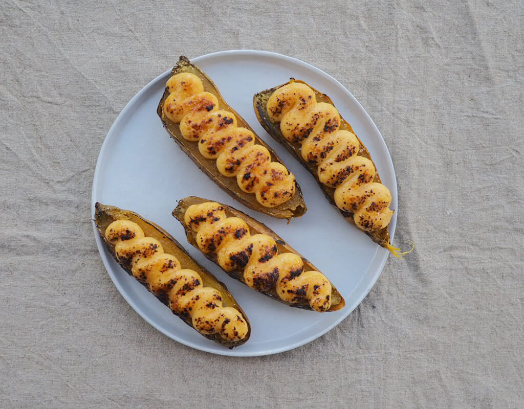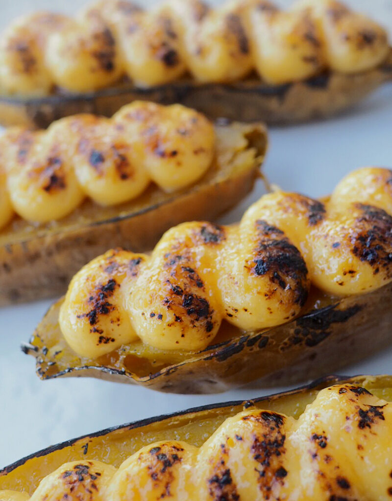⑤ 取出已放涼的吉士醬,以電動打蛋器打勻1-2分鐘,吉士醬會變得順滑有光澤,放入備有1cm直徑唧花咀的唧花袋,於蕃薯橫切面上以S型唧出吉士。最後均勻地撒上一層砂糖,以火槍炙燒出焦糖脆面。