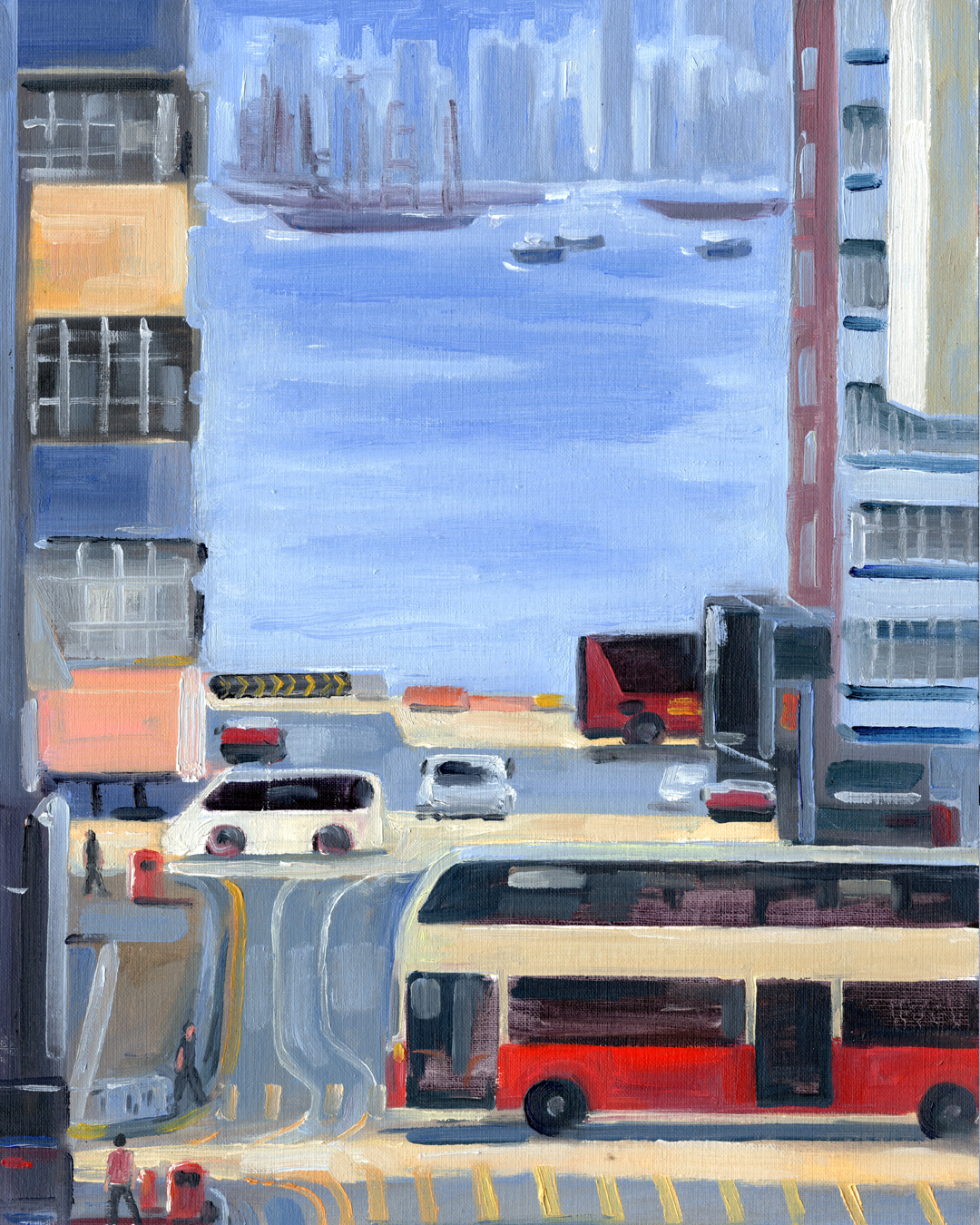 想起地球另一邊的香港,行一個長命斜,回頭望見夾縫中的海,貨輪緩慢的移動,空氣質素未夠理想,海對面的高樓有點模糊,但溫度適宜,陽光和街道交錯,雙城巴士和行人穿行其中,它們好像誠實的血管和細胞。