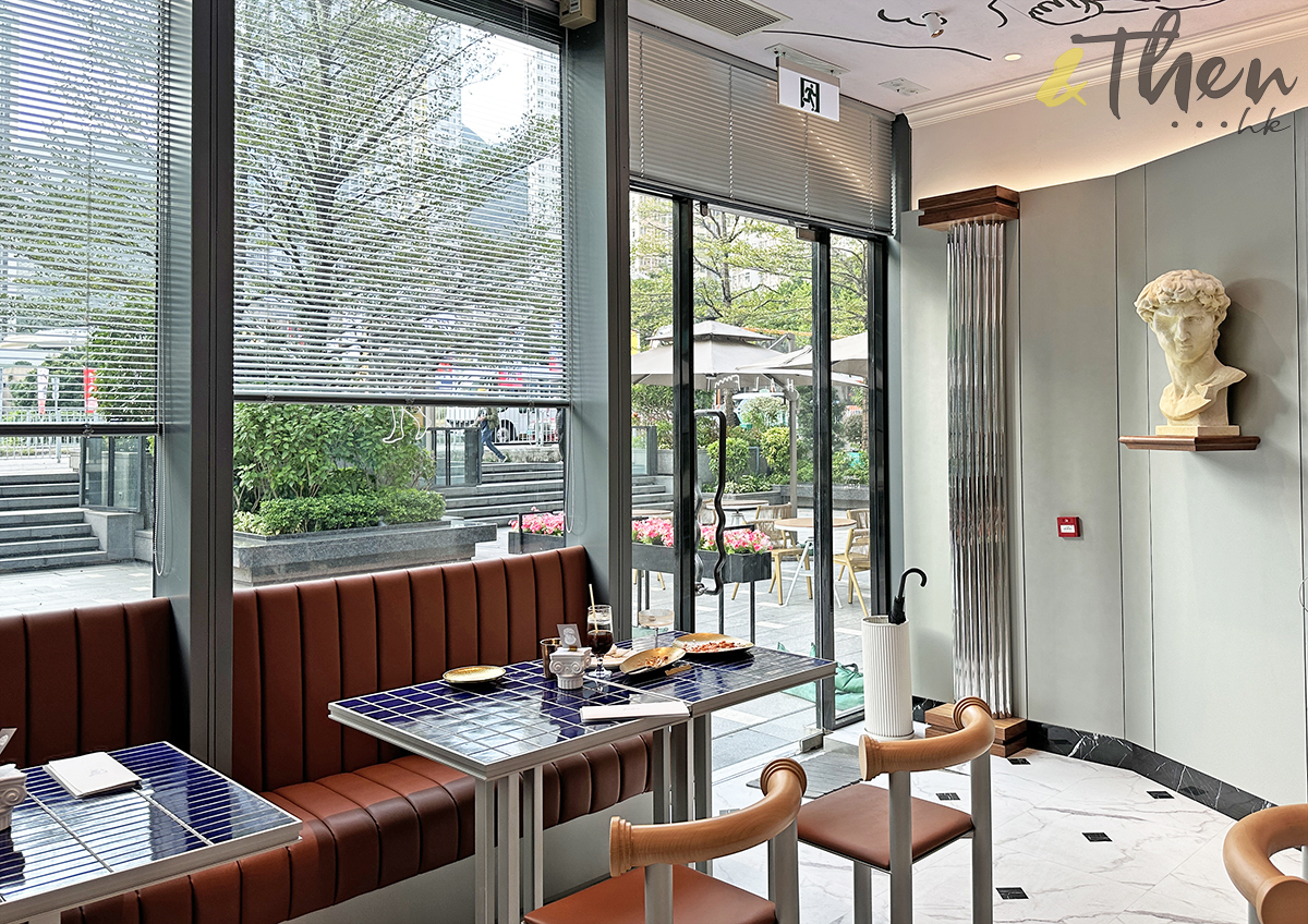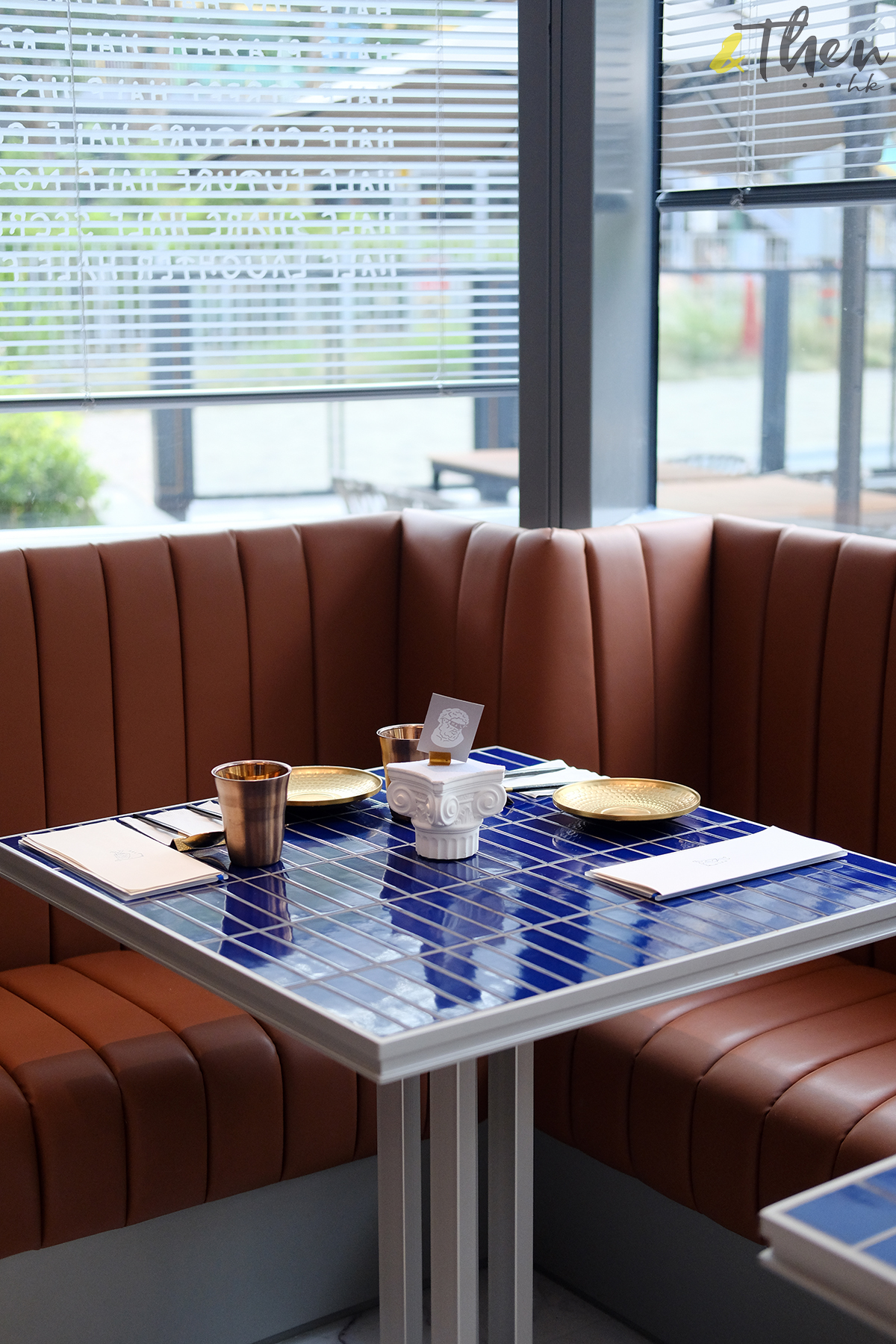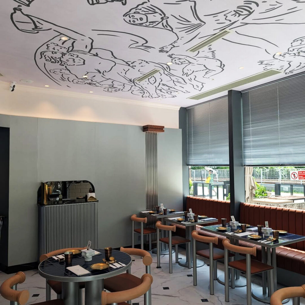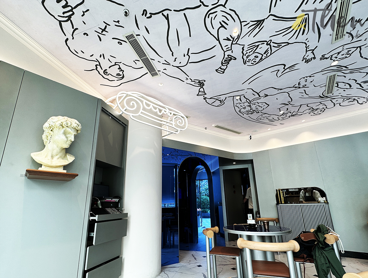 餐廳的裝潢設計靈感來自地中海,抬頭是玩味十足的手繪天花,以文藝復興時期的教堂壁畫為主題,但捨棄了教堂的莊嚴感,改以簡約的黑白線條呈現。配搭用色大膽的紫藍色餐桌與金色餐具、羅馬柱造型裝飾,以及右眼被打了一拳的大衛頭像雕塑,格調鮮明。