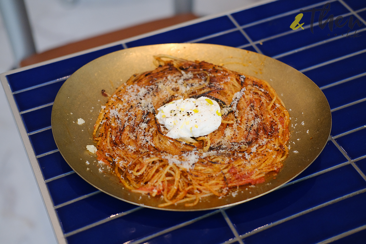 刺客意粉源自1960年代意大利南部地道菜,其特色在於先煎後煮:將硬質意粉煎至微焦,再以辣醬汁煨煮至軟身,同時又有酥脆的口感。搭配Burrata Cheese享用,可中和辣度,還增添滑順口感。