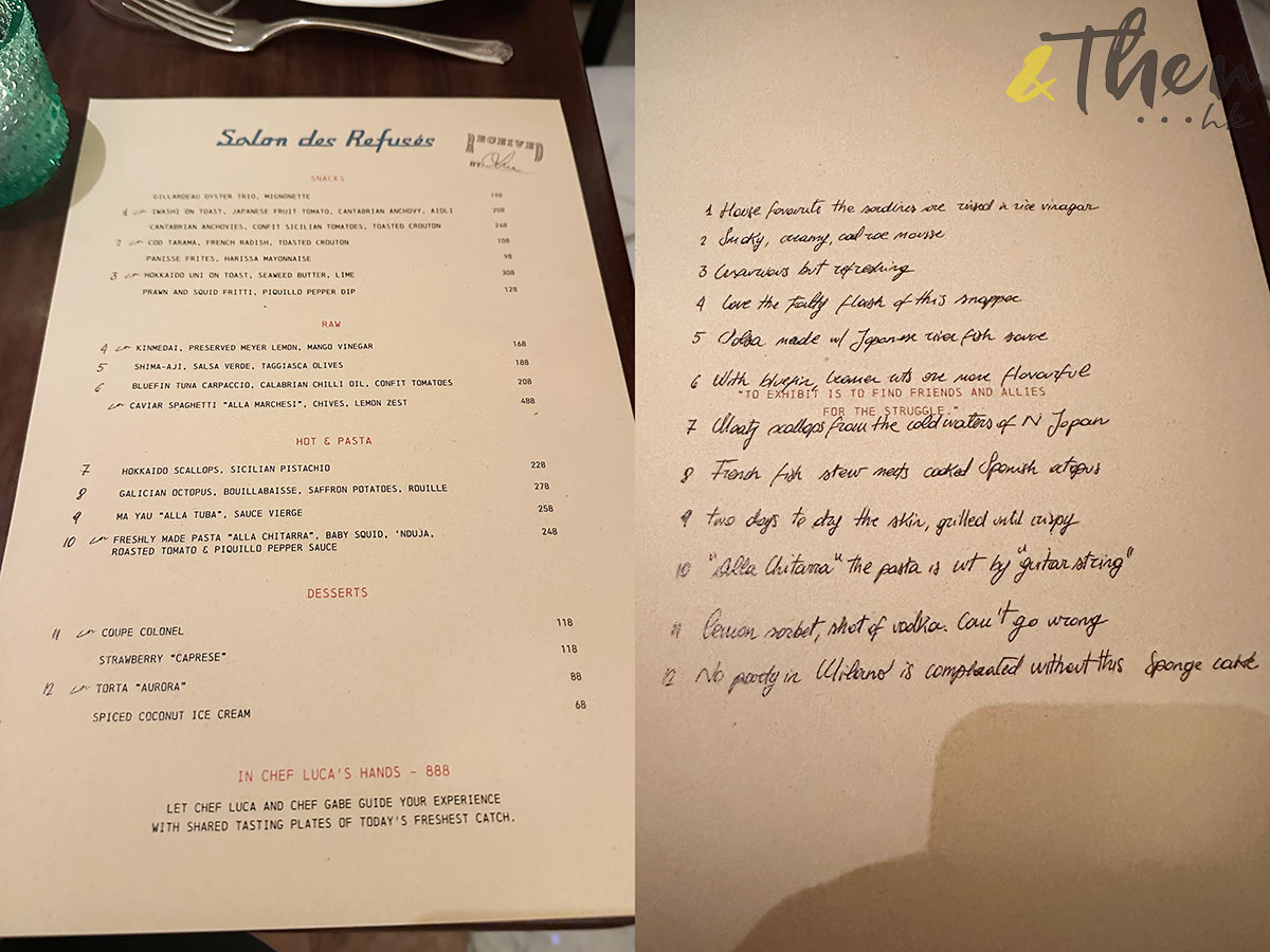 細閱餐牌和每日精選的黑板,一頁紙上有齊輕食、生鮮、意粉及甜品,在猶豫點選哪道菜式之際,翻到後頁原來還手寫了各道菜的簡短介紹,為選擇困難人士推供了選菜推介。這裡的每道菜,都以分享式小碟呈現,每碟份量僅為兩至三口的Tapas size,似足居酒屋一樣,到呢一刻仍陷入選擇困難的話,可直接選擇「In Chef Luca’s Hands」嚐味套餐(每位$888),任由廚師發辦餵飼。