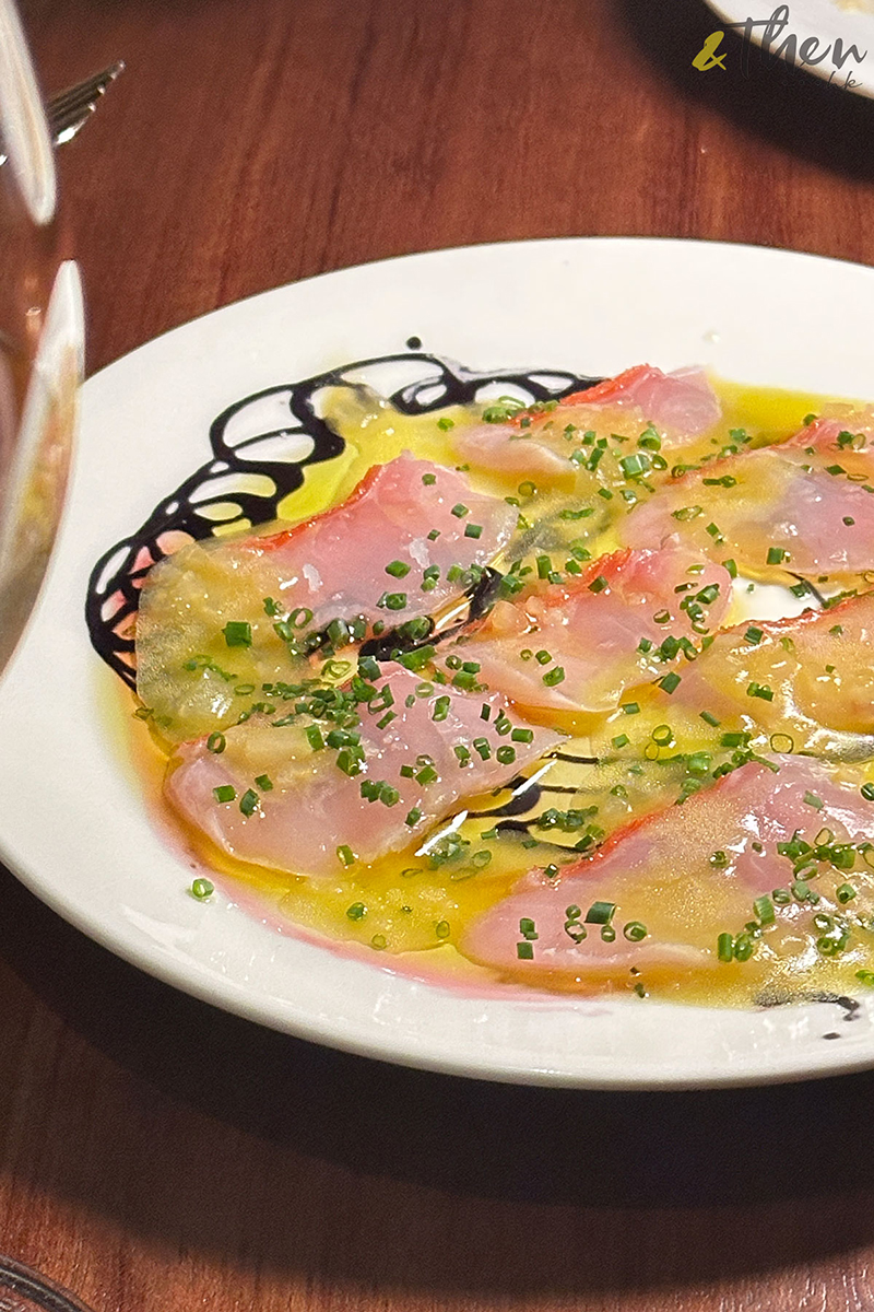 海鮮選項更像居酒屋,有刺身生吃的金目鯛、池魚或藍旗吞拿魚,配以地中海式烹調方式,如以芒果醋及檸檬汁橄欖油調味的金目鯛魚片、把藍旗吞拿切成牛肉他他薄片再搭配油漬番茄,將海鮮鮮味帶到另一層次。