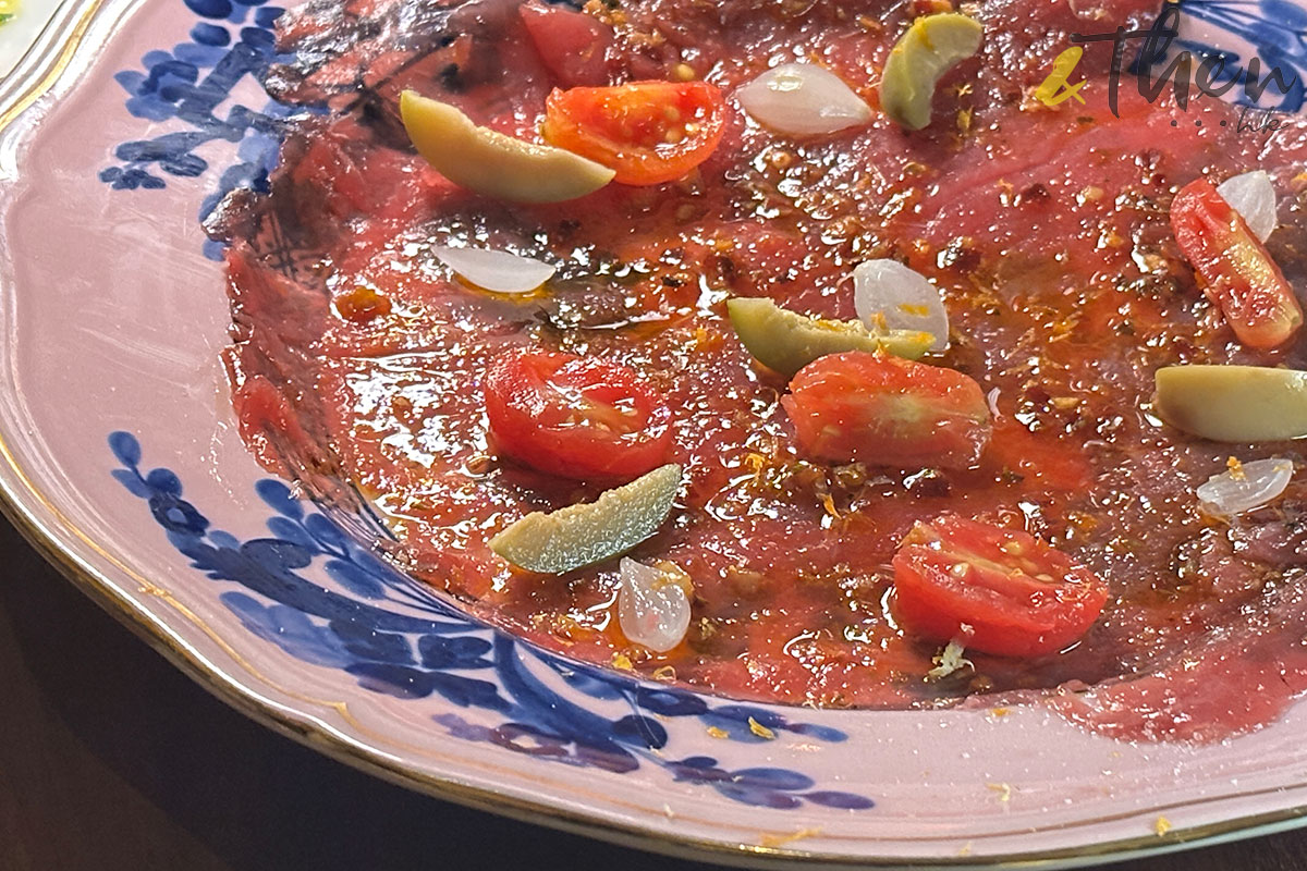 切片並刴成carppaccio一般的藍旗吞拿魚,其鮮味在番茄與橄欖的調和下,更顯甜味。
