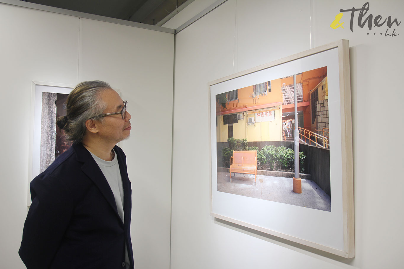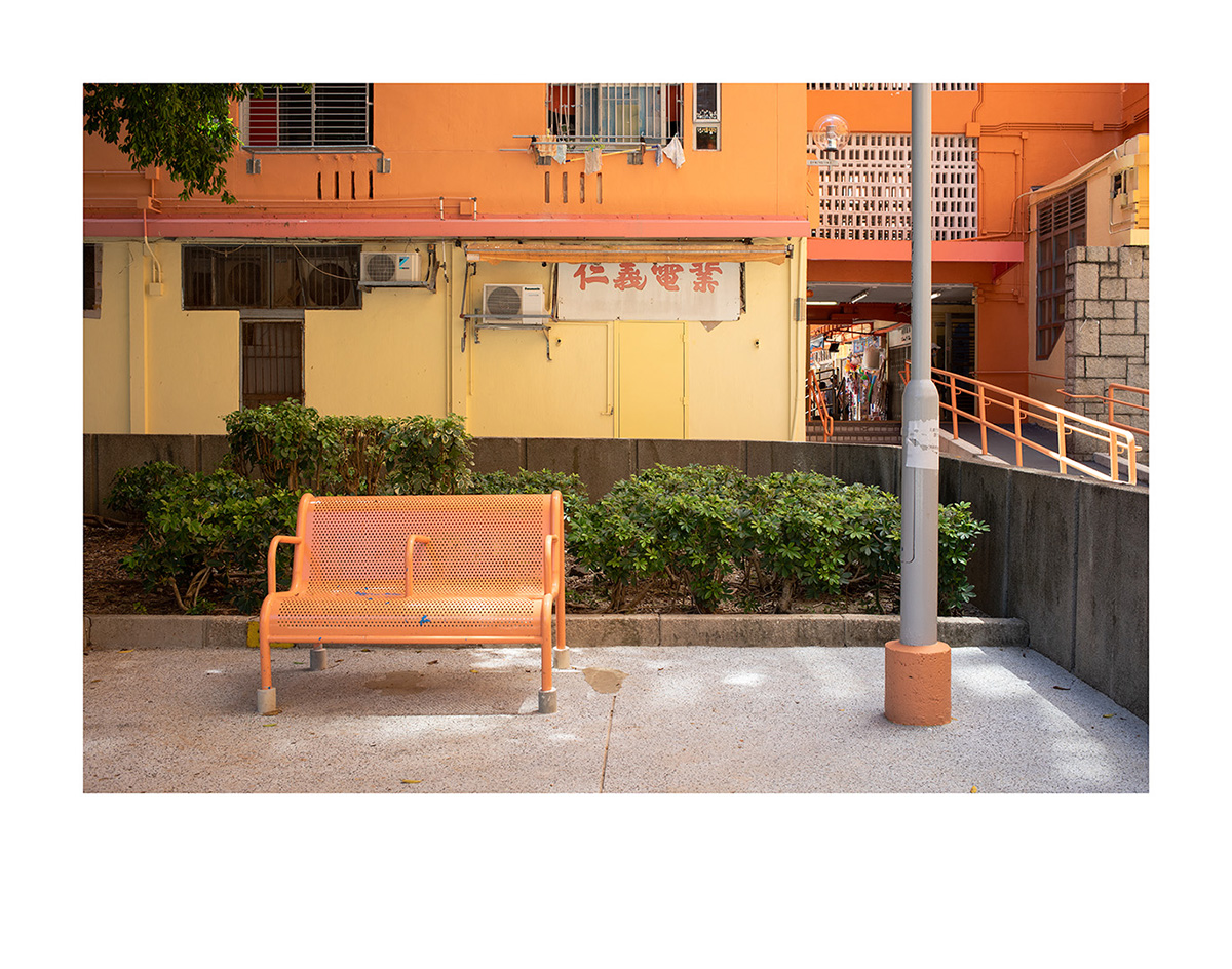 任職攝影師超過20年的Lok,曾在傳媒界工作,拍過眾多題材,私下一直鍾情舊屋邨,那自然成為他拍《Walks of Colours》的地點之一。其中一張作品,攝於色彩鮮艷的柴灣漁灣邨,「我先從顏色出發,發現電燈柱底座、長櫈和屋邨外牆全是橙色。」畫面的點睛之處,是有個「仁義電業」的店舖招牌。「原來招牌遮蓋著破爛的洞,這令我有另一種解讀和聯想——仁義(道德)這回事,是否只流於表面?」