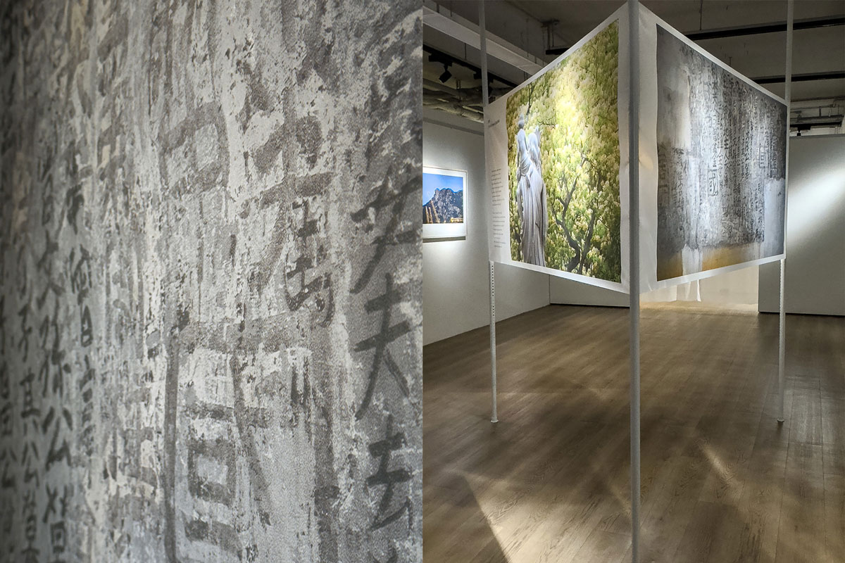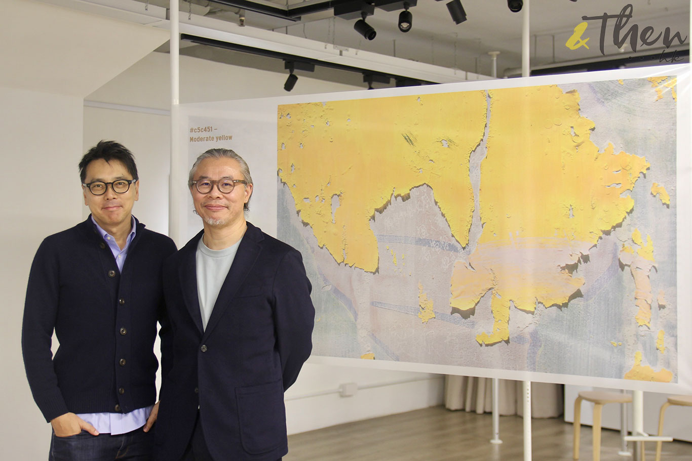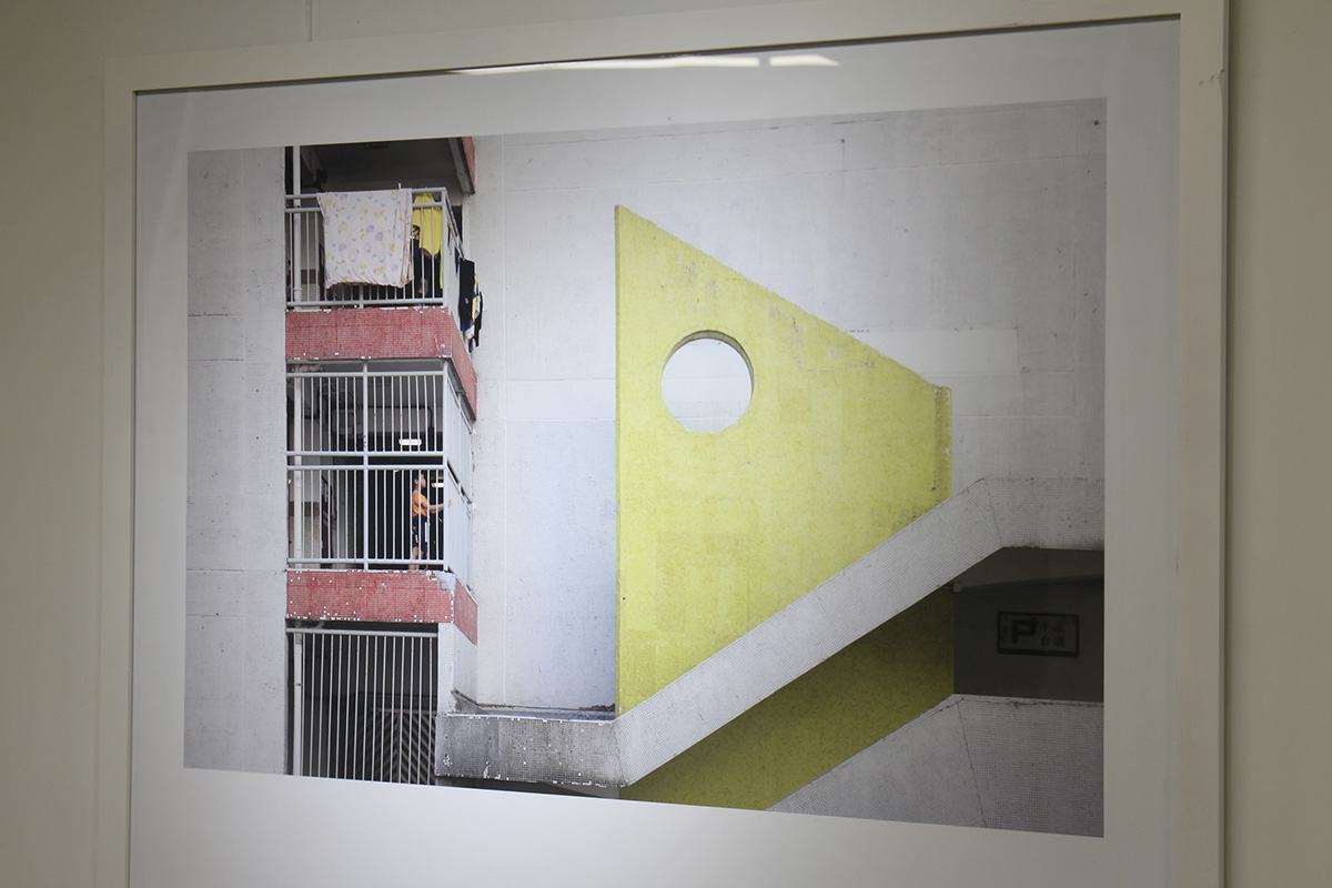 artellex工作室展示了十多張《Walks of Colours》作品,尺寸固然比攝影集大得多,Lok看著有感:「質感、顏色的呈現均與書中不一樣,我自己也很驚喜。同一張相以不同方式呈現,的確讓人有新的閱讀方式。」場地中央,另有相片打印在合成布料上,輕盈透光,多了一抹詩意,尤其Lok所拍的深水埗南山邨。「我拍了遊樂場一道牆,上面有『我愛你』等字句塗鴉,屋邨管理處用黃色油漆把它遮蓋。經過年月洗禮,油漆剝落了,塗鴉又再浮現出來。」