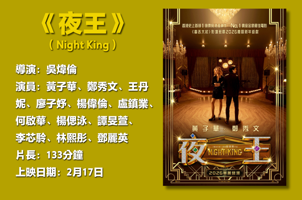 《毒舌大狀》導演吳煒倫及黃子華等台前幕後班底,再加鄭秀文,舞台由法庭轉到夜總會,《夜王》同樣有對抗強權的情節,笑料亦加倍(楊偉倫的搞笑演出更屬全片亮點),還有對香港昔風光的緬懷,對未來也帶希望(懂得求變,一切皆有可能)。故事講述2012年曾在尖東風光一時的東日夜總會被收購,在尖東打滾數十年的大經理歡哥(黃子華飾)要面對時代轉變的挑戰,新任CEO、歡哥前妻V姐(鄭秀文飾),強迫歡哥及一眾女公關轉型而令東日漸有起色。怎料背後原來二人是受大財團的操控,為了保住東日,歡哥及V姐誓要作最後反撲……吳煒倫有見尖東的故事,跟現在的香港有一種奇妙的共鳴,而構思此片,當中有緬懷但並不消極。子華神漸漸跟他過往的楝篤笑形像越走越遠,瀟灑中見滄桑、重義氣亦重感情,表現多樣化;貴為影后的鄭秀文演夜總會話事人亦入型入格。加上一眾女星王丹妮、廖子妤、楊偲泳、譚旻萱、李芯駖等以艷麗女公關模樣登場,又帶來一個教觀眾入場的理由!