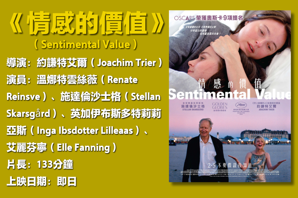 獲今屆奧斯卡9項大獎提名的挪威電影《情感的價值》(Sentimental Value)實力絕不容忽視。導演約謙特艾爾(Joachim Trier)在寫家庭成員的情感關係確有一手(11年前他首齣英語電影《響亮的秘密》(Louder Than Bombs)便是一例),今次他繼《世上最爛的人》(The Worst Person in the World)後再讓溫娜特雲絲薇(Renate Reinsve)當女主角,與在荷里活縱橫多年的瑞典影星施達倫沙士格(Stellan Skarsgård)合演不一樣的父女情:羅娜(溫娜特雲絲薇飾)是奧斯陸舞台劇演員,他跟妹妹安妮絲(英加伊布斯多特莉莉亞斯(Inga Ibsdotter Lilleaas)飾)是最親近的依靠。二人的著名電影導演父親古斯塔夫(施達倫沙士格)多年前拋下家庭出走後,他重新闖入兩姊妹的生活,更邀請羅娜主演他寄予厚望的復出之作……由父女間的恩怨,再延伸至二人不同的藝術途徑與自身複雜關係,再訴說父親小時候不一樣的成長,親情間的裂縫,不只靠藝術修補,最重要是各人能否面對自己及向對方坦誠。