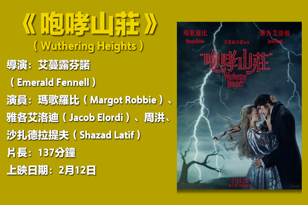 Emily Brontë的唯一著作《咆哮山莊》(Wuthering Heights)曾被改編成無數影視作品,曾憑《超犀女王》(Promising Young Woman)獲奧斯卡最佳原著劇本獎項的編導艾蔓露芬諾(Emerald Fennell)再與瑪歌羅比(Margot Robbie)合作(瑪歌為《超》的監製),二人一編導一監製,後者並當女主角,一起把《咆哮山莊》這經典鉅作再搬上大銀幕。故事講述雅各艾洛迪(Jacob Elordi)飾演的Heathcliff為Earnshaw家所收養的孤兒,他與Earnshaw家小姐Cathy(瑪歌羅比飾)漸漸相戀,卻因不同狀況,致二人愛與恨糾纏不清……浪漫加激情,自然有捧場客。有批評指演員雅各艾洛迪為白人,但原著小說中的Heathcliff並非白人,對此選角安排感不滿。但請留意,Emily Brontë的原著小說對Heathcliff的出身其實語焉不詳,三十多年前白人演員賴夫費恩斯(Ralph Fiennes)也不是演過Heathcliff嗎?什麼政治正確有時都幾煩人!