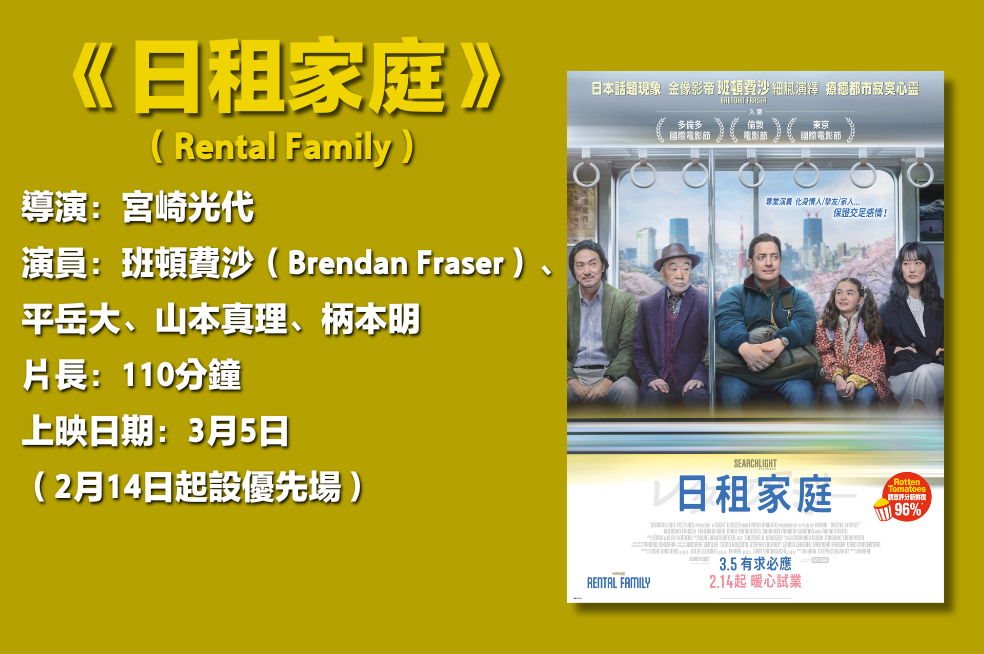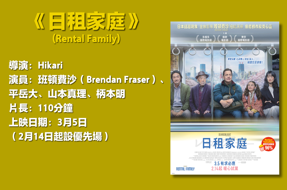 在日本,原來早在上世紀八十年開始已有「出租家庭」這一門產業,經營這門生意的「出租家庭」公司會為客戶尋找對方需求的一些人生角色,包括家人、朋友、愛侶等。《齮齕人生》(BEEF)導演宮崎光代對這個行業產生好奇,並成為其創作靈感而執導《日租家庭》(Rental Family):金像影帝班頓費沙(Brendan Fraser)飾演的演員Philip在東京發展演藝事業卻處處碰壁,他在迷惘中竟意外獲得一份離奇的工作,受傭於「出租家庭」公司,按客戶需求扮演那些缺席的人生角色如家人、朋友,摯愛等,Philip起初覺得格格不入,但他也逐漸與陌生人建立起真摯情感……導演亦表示其遇到的每個選用出租家庭服務的人,其實都在尋找歸屬感,而演家人的演員也真的百分百投入這段關係。讓別人空虛的內心得以填補,但演員又怎樣填補自己的空虛內心?這正是電影的深層探究。